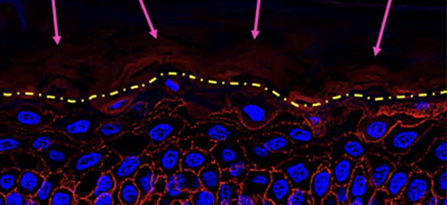 • Hematoxylin-Eosin staining shows that the treatment induces morphological changes directly in the skin region responsible for barrier function (stratum corneum).