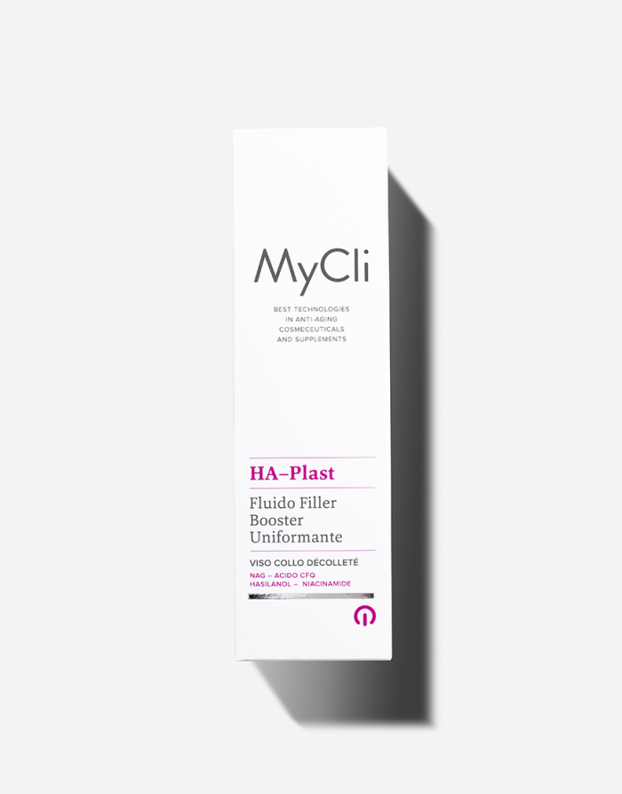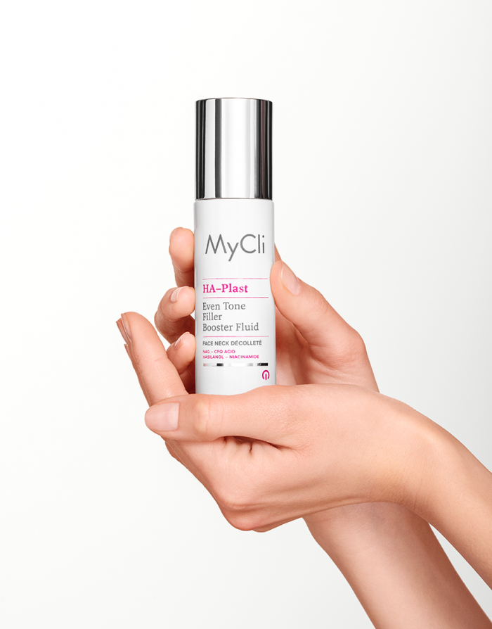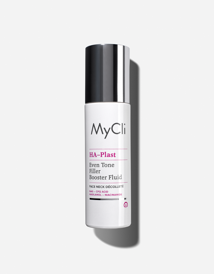 MyCli HA–Plast Even Tone Filler Booster Fluid is a lightweight polymeric emulsion with filling effect. Its formula stimulates the synthesis of endogenous Hyaluronic Acid, giving the skin density and counteracting the loss of volume. It also boosts the activity of fibroblasts and increases the epidermal moisture. The skin looks fuller, plumper, and hydrated. Integrated micromolecular technology formulated with NAG, CFQ Acid, Niacinamide, and specialized Silanol.