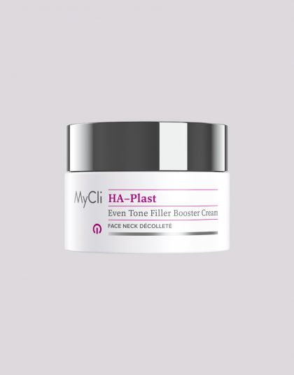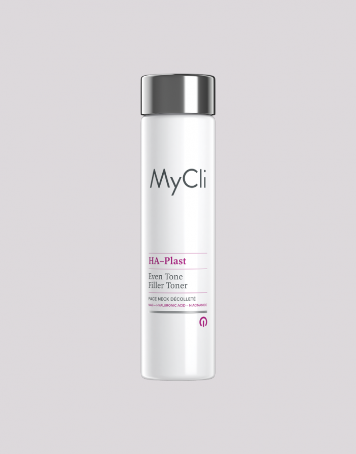 MyCli HA–Plast Toner is a daily lotion to complete cleansing and prepare your skin for the next treatment. Its formula stimulates the synthesis of endogenous Hyaluronic Acid, leaving your skin soft and hydrated and it counteracts discoloration to reveal an even and healthy skin tone. The fast-absorbing hydrophilic carrier guarantees a perfect conclusion to the daily cleansing of face, neck and décolleté before applying the suggested anti-aging protocol and an excellent penetration of the active ingredients. Integrated micromolecular technology formulated with NAG, Hyaluronic Acid and Niacinamide.