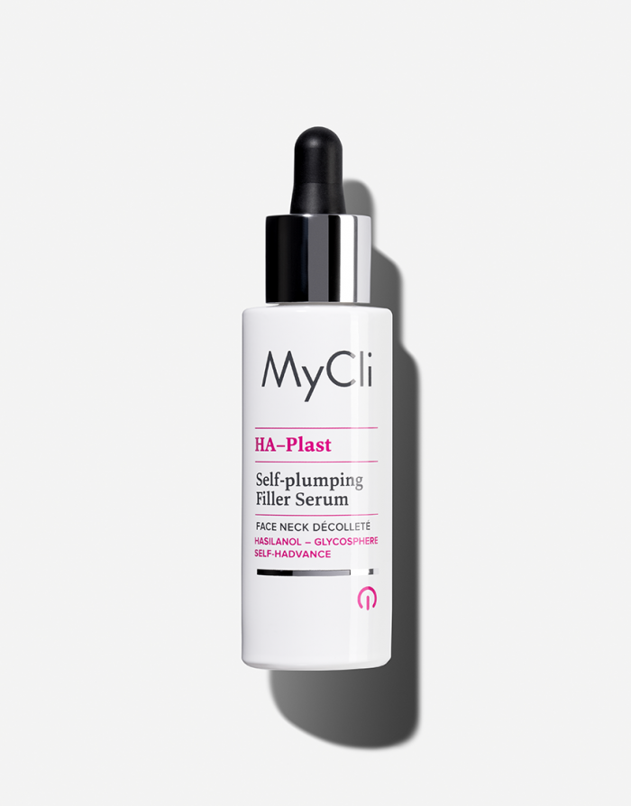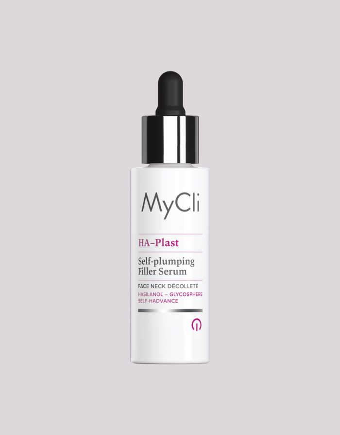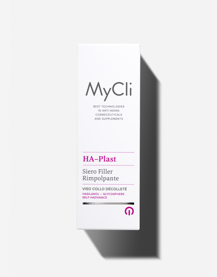 MyCli HA–Plast is an advanced fluid treatment formulated with a high concentration of Hyalurionic Acid precursors for volumizing effect. Its formula stimulates the synthesis of endogenous Hyaluronic Acid to give the skin density and structure. It also enhances the activity of fibroblasts, remodels the extra-cellular matrix, and boosts the skin moisture providing an elastic, smooth, firmer, and fuller appearance. Micromolecular technology based on specialized Silanol, Glycogen and tripeptide that stimulates the synthesis of endogenous Hyaluronic Acid.