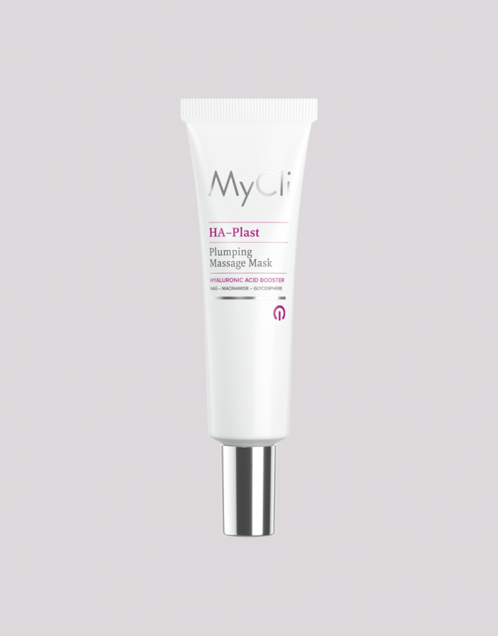 MyCli HA-Plast Massage Mask is a treatment with filler booster effect that boosts microcirculation. Its formula stimulates the production of endogenous Hyaluronic Acid to give the skin plasticity and softness. Its innovative carrier allows a punctual massage on all the areas indicated, promoting the increase of epidermal hydration, firmness and turgor. Integrated micromolecular technology formulated with NAG, Glycogen, Niacinamide and Hyaluronic Acid.