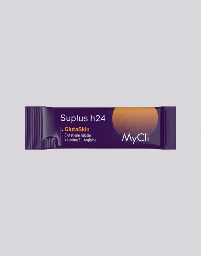 Suplus h24 is the new line of food supplements from MyCli that combines the most effective raw materials for the management of aging-related phenomena with a skin-body-mind approach based on the principles of chronobiology. GlutaSkin is a dietary supplement based on reduced glutathione, in a soluble and rapidly absorbed sublingual form, which helps to maintain the physiological levels of glutathione in the body, useful in cases of reduced intake with a diet or increased needs for this nutrient. It also contains Vitamin E which protects cells from oxidative stress. The functional ingredients of the product are conveyed in a patented technology that ensures excellent absorption and skin bioavailability.
