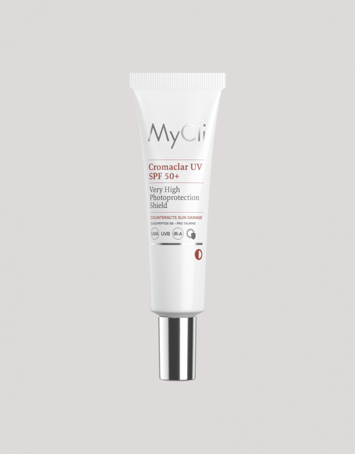 MyCli Cromaclar UV SPF 50+ is a liquid photoprotective shield made specifically for the daily protection of skin prone to dyschromia. Its formula not only effectively protects the skin from the sun’s UVA and UVB rays, but also intervenes by blocking the release of melanin by the melanocyte, thus counteracting the appearance of new spots. In addition, it has a complete antioxidant effect against infrared (IR-A)-induced damage. Integrated micromolecular technology based on the latest generation of sun filters (very high protection SPF 50+), Oligopeptide-68, and Pro Taurine.